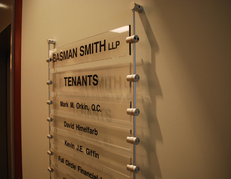 The everyday essentials of office identity — desk, door, and suite signs in a full range of materials and finishes. The thing your tenants order most.